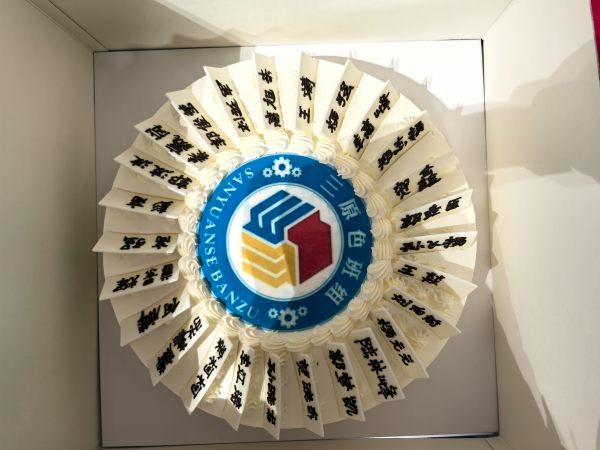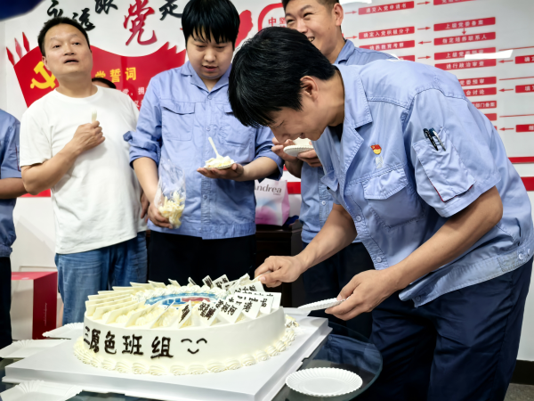 學習結束后,就進入了第二個班組活動——回顧往昔,慶祝“三原色”三歲生日。磨工班組的成員們齊聲喊出“磨工班組三歲啦!”,有人趕忙去拿蛋糕,有人忙著搬桌子,還有人拆蛋糕包裝。組員彭高和高強小心翼翼地拿著蛋糕轉來轉去,認真找著合適的角度,想把這開心的一刻拍下來留作紀念。作為這個大家庭的一員,每個人都在用心為這場慶祝活動出力,充分展現出團隊的凝聚力 。