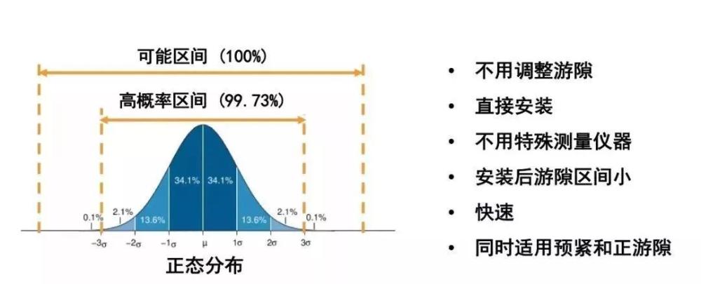Set-Right使用概率方法并控制相關(guān)零件的尺寸公差來確保所有的裝配總成中有99.73%的軸承游隙落在可接受的范圍內(nèi)。這是一組隨機變量組合后的數(shù)學預測,變量就是軸承公差和軸、軸承座等安裝組件的公差。