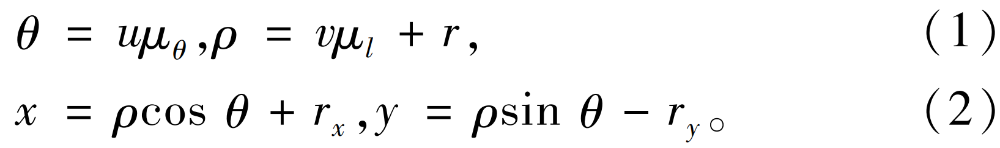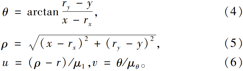 如圖8所示,點P的x,y坐標分別表示其距離原點O的水平距離與垂直距離;點P'的坐標u,v分別表示點Р在圖8a中相對圓心(rx,ry)的極角與極徑。
