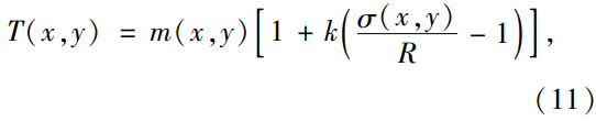 經過大量試驗對比,選擇Sauvola局部二值化算法12進行圖像分割。計算以點(x,y)為中心的窗口模板內的灰度均值m(x,y)與標準方差σ(x,y) ,則點(x,y)的閾值T(x,y)為