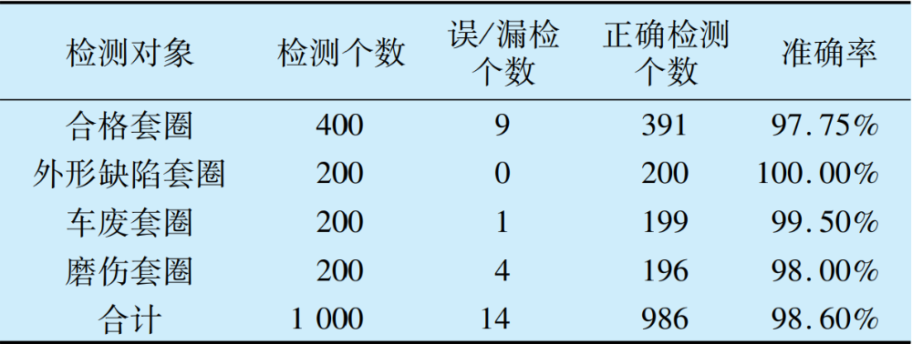 另外,對不同型號的套圈也進行了多次檢測,識別準確率較高,誤漏檢率較低,響應時間較短,并能實時統計被檢測套圈的型號、數量、合格率、缺陷種類等數據,滿足企業生產在線檢測要求,可以替代人工實現檢測。